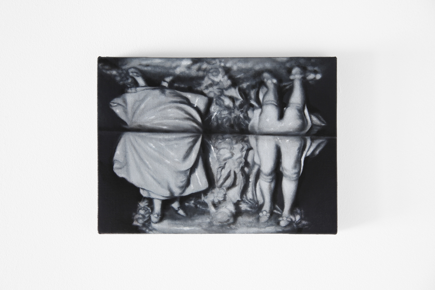‘MIRROR RIM’ by Alain Urrutia is a series of eleven paintings made to flip around, like a mirror, reflecting a fragmented and reconstructed alternative reality. Where he previously made super large paintings, these realistic small format black and white images, reframed and alienated from their historical value, are made to question our interpretations. The MIRROR RIM project was born from the idea of making two exhibitions in two different places that would change when moving from one space to the second one . The works from MIRROR RIM are composed symmetrically on their horizontal axis. The mirrored images we get in this way can be flipped 180 degrees. This is what happens when the exhibition is moved from one gallery to the second one. The paintings have been rotated so this second exhibition at Appleton Square in Lisbon, would work as the reflection of the first exhibition at the DIDAC Foundation in Santiago de Compostela. Hence the title of the exhibition, MIRROR RIM, a palindrome that refers to the edge of the mirror.