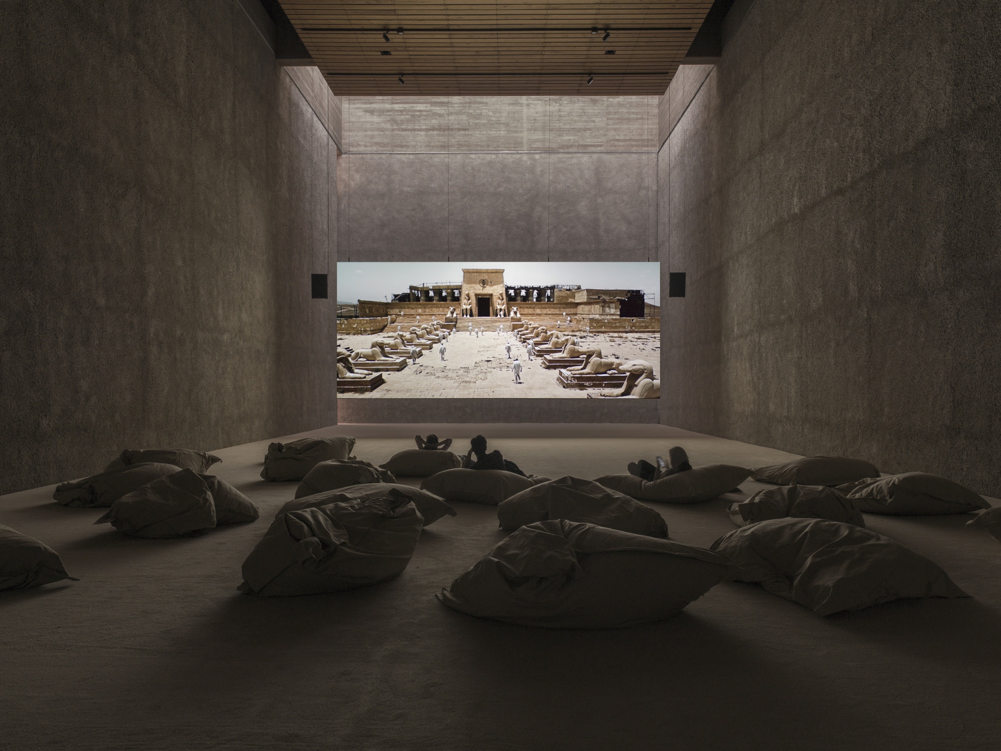 After having seen it ourselves this afternoon, for those in and around Berlin, make sure to drop by the incredible KÖNIG GALERIE to witness German artist Julian Rosefeldt’s first solo exhibition at the gallery. On view in the nave of former Catholic church St. Agnes is his large video installation titled ‘In the Land of Drought’ that was filmed in Morocco and the Ruhr area. A condensed version of Rosefeldt’s filmic interpretation of Joseph Haydn’s ‘The Creation’, ‘In the Land of Drought’ confronts the relationship between man and his impact on the world. Set to atmospheric sounds and a pulsating hum, the 43-minute piece looks back from an imagined future upon the post-Anthropocene: the aftermath of significant human influence on Earth. An army of scientists appear to investigate the archaeological remnants of civilization after humanity has made itself extinct. Shot entirely using a drone, Rosefeldt’s images hover meditatively over the desolate landscape and ruins. Connoting surveillance, the drone’s bird’s eye view removes human perspective with us onlookers kept at a distance throughout. Increasingly, more figures dressed in white lab suits emerge to inspect the ruins of civilization – which are in fact abandoned film sets close to the Moroccan Atlas Mountains.