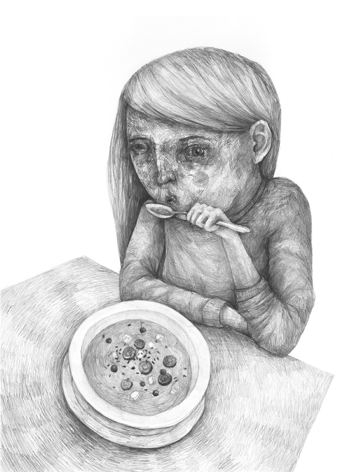 We are big fans of the very gifted Austrian artist and illustrator Stefan Zsaitsits. Having an extraordinary strong signature running through all his work, the artist who’s still based in his country of birth, creates captivating dark pencil drawings of mostly childlike figures in which he oftenly seems to hybridize particular thoughts and emotions directly on or with the body part which is involved. The highly delicate and at times slightly repulsive raw images evoke a sense of unsettlement, although there is also great beauty to be found even in the smallest details, sometimes under a layers of scratched pencil marks — underscoring the many, at times literally, layers one finds in his thought-provoking creations. As of recently he has moved beyond just the pencil (after having worked with paint some years ago too) and in his latest works color —mostly a blood colored red— is thoughtfully applied, creating another level of depth in his depictions. A collection of these latest works open for the public today, in the Salzburg-based Galerie Trapp, where Zsaitsits presents his newest creations in an exhibition named ‘Zwischen Luv und Lee’.